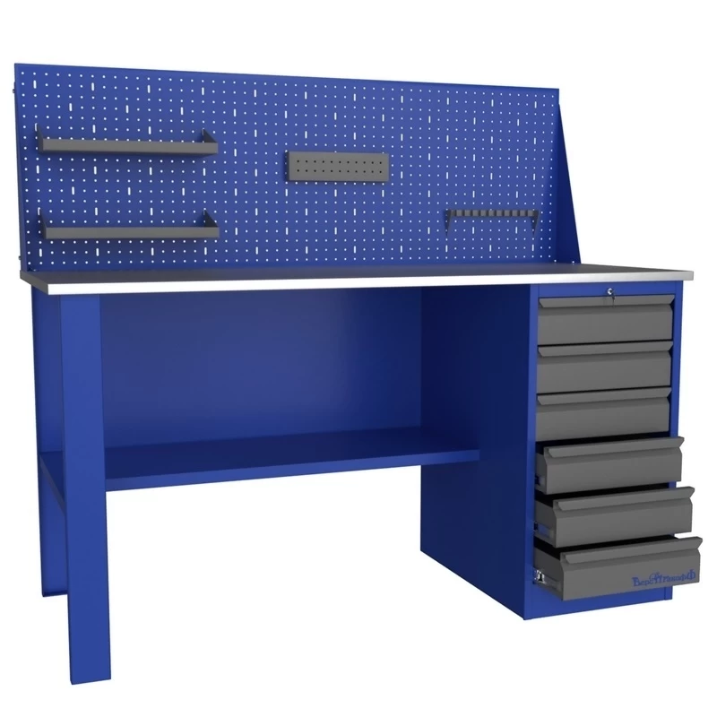 - Предлагается большой выбор моделей и возможность собрать верстак под индивидуальные потребности – из однотумбовых и двухтумбовых столов, тумб пяти видов, перфорированных экранов, шкафов и так далее.